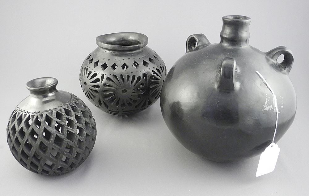 LOT 119 Three Blackware Pottery Items: Dona Rosa Candle & Two Pots, 4 3/8 - 7"h. Estimate: $60 - $100 Sold For: $100 Auction Date: Tuesday, September 30 2025 at 4:00 PM