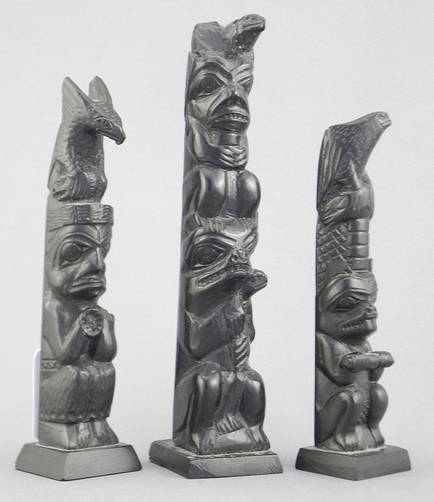 LOT 249 Three Haida Argillite Model Totem Poles, 5 3/4 - 7"h (chipped & restored). Estimate: $150 - $300 Sold For: $500 Auction Date: Tuesday, January 20 2026 at 4:00 PM