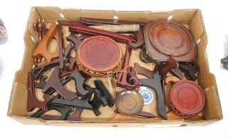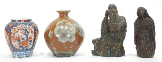 Collection of Various Asian Vase & Plate Stands with 2 Wood Figures/ 2 Vases.