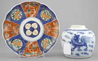 LOT 182 Chinese Blue & White Porcelain Jar (4 7/8"h) with Imari Dish, 18 7/8" Diam. (chipped). Estimate: $60 - $100 Auction Date: Tuesday, January 20 2026 at 4:00 PM