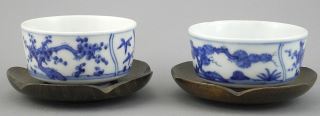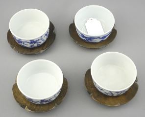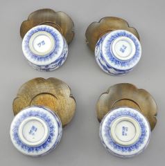 LOT 129 Four Japanese Blue & White Porcelain Cups (1 1/2 c 2 3/4" diam.) with Wood Stands, 5 5/8", NO EX Estimate: $50 - $100 Auction Date: Tuesday, January 20 2026 at 4:00 PM
