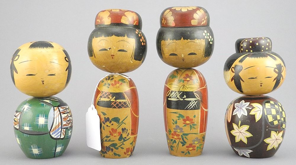 Japanese Bronze Crab Okimono and Four Kokeshi Dolls.