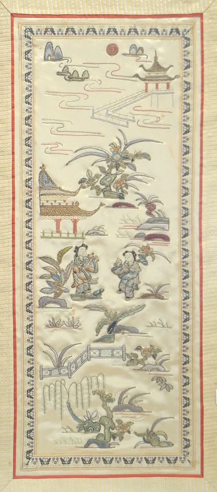 Pair of Chinese Silk Embroidery Panels, 21 x 8 1/4".