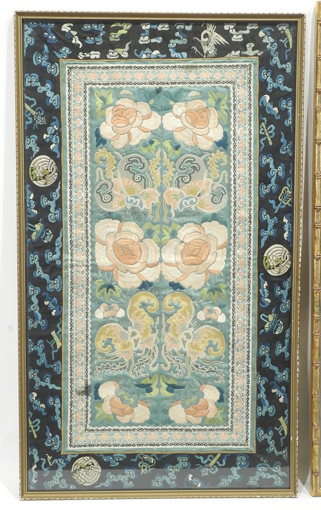 Four Chinese Silk Embroidery Sleeve Panel Pairs, Framed, Largest 28 1/2 x 15 1/4 (glass noted).