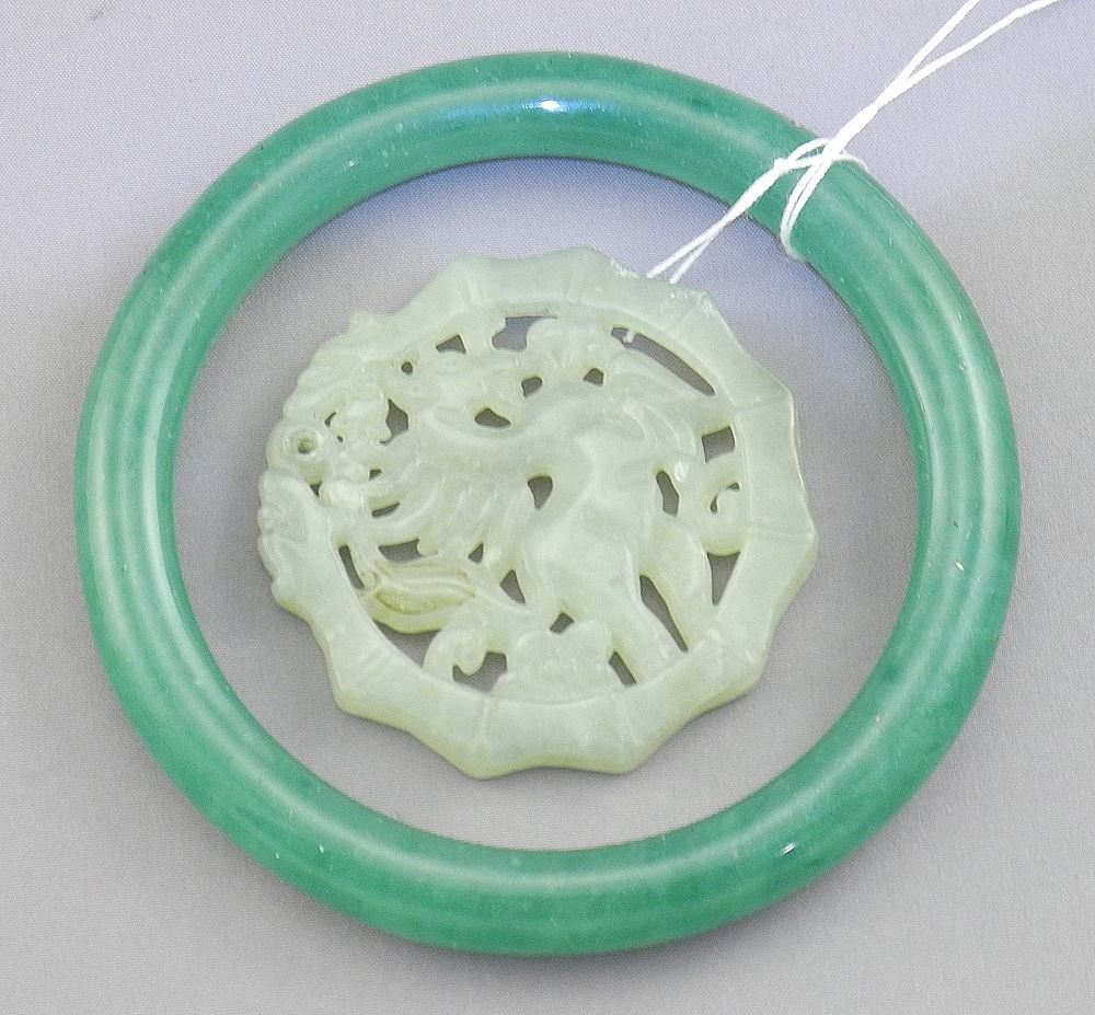 LOT 294 Chinese Jade Bangle & Horse Pendant, 3 1/2 & 5" Diameter. Estimate: $60 - $100 Sold For: $250 Auction Date: Tuesday, January 20 2026 at 4:00 PM