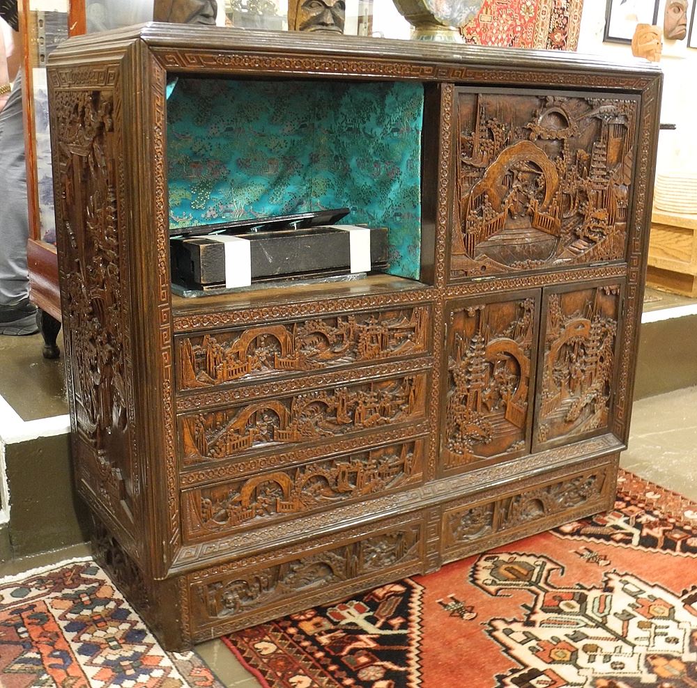 Chinese Deep Carved Fall Front Secretary Cabinet, 43 1/2 x 49 1/2 x 17 3/4".