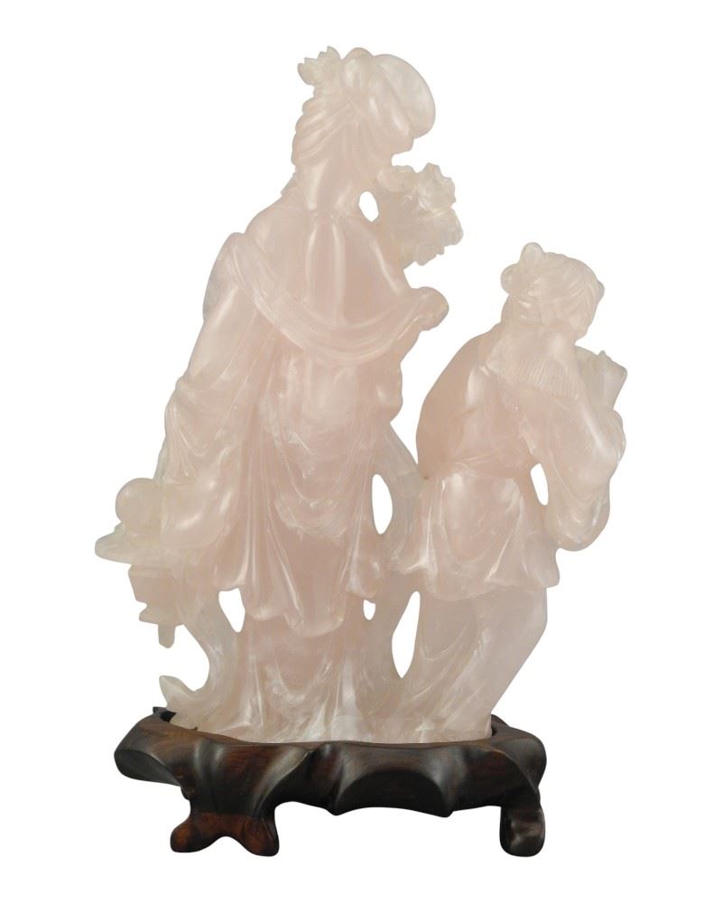 LOT 122 Chinese Rose Quartz "Maiden & Attendant" Carving with Stand, 7 3/4 "h. Estimate: $150 - $300 Sold For: $130 Auction Date: Tuesday, January 20 2026 at 4:00 PM