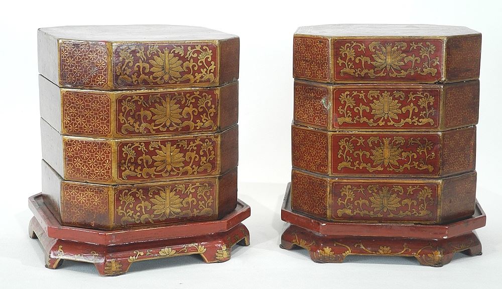 Pair of Chinese Gilt Scarlet Lacquer Stacking Boxes, 8 1/8 x 7 1/2 x 7 1/2".