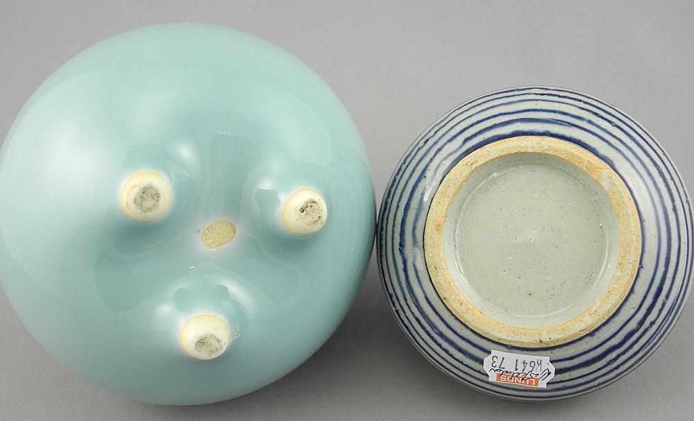 Two Japanese Porcelain Items: Shigaraki Vase (2 7/8"h) & Celadon Censer, 4 3/4"h.