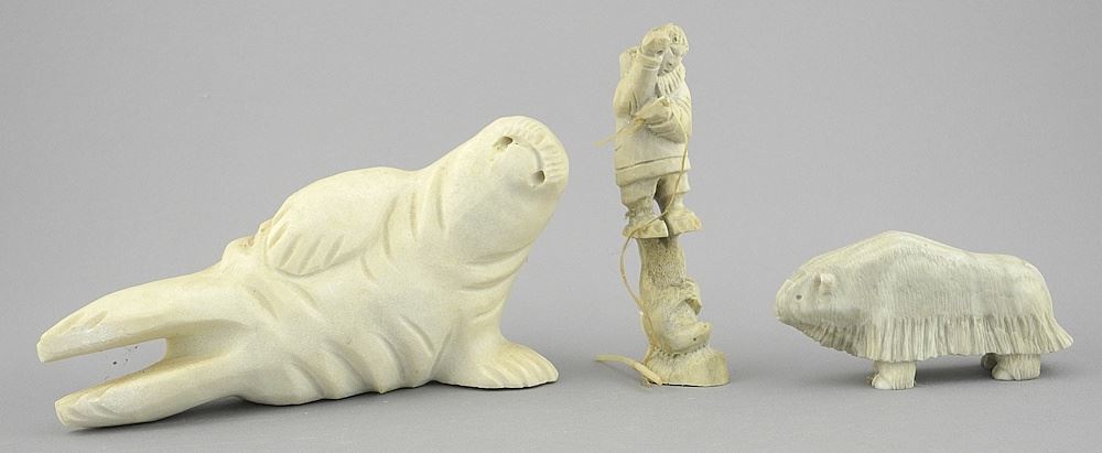 LOT 128 Five Inuit Stone & Antler Carvings signed Pamialok (2)/Okhiatak/Gary A. /NK, 1 3/4 - 6"h. Estimate: $150 - $300 Sold For: $70 Auction Date: Tuesday, January 20 2026 at 4:00 PM