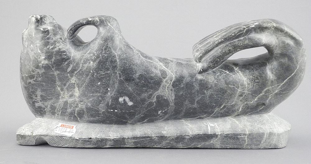 LOT 139 Inuit Sculpture signed with Syllabics & 169-786, 11"w., "Reclining Seal". Estimate: $100 - $200 Sold For: $60 Auction Date: Tuesday, January 20 2026 at 4:00 PM