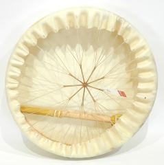 Northwest Coast Hide Drum w/ Stick, signed Joan I.Glendale Hekgwagilsgwa , 3 x 18" Diam., April 201