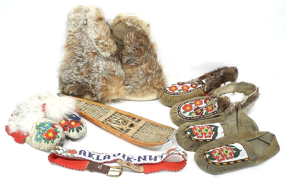 Three Pair of Beaded Tanned Hide Moccasins with Fur Mitts/Aklavik Belt/Snow Shoes.