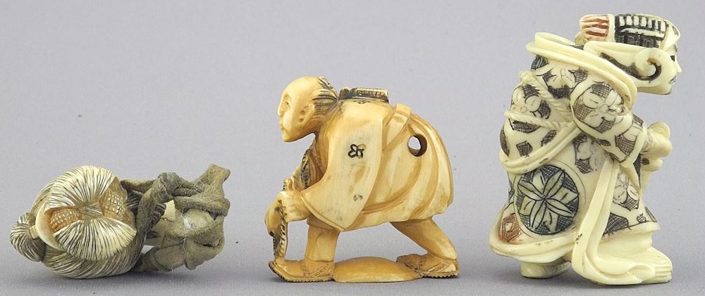 LOT 250 Three Japanese Netsuke: Head of a Lady/Tying Shoe/Robed Figure, 1 3/8- 2"h, 71.5g, NO EXPORT. Estimate: $100 - $200 Sold For: $250 Auction Date: Tuesday, January 20 2026 at 4:00 PM