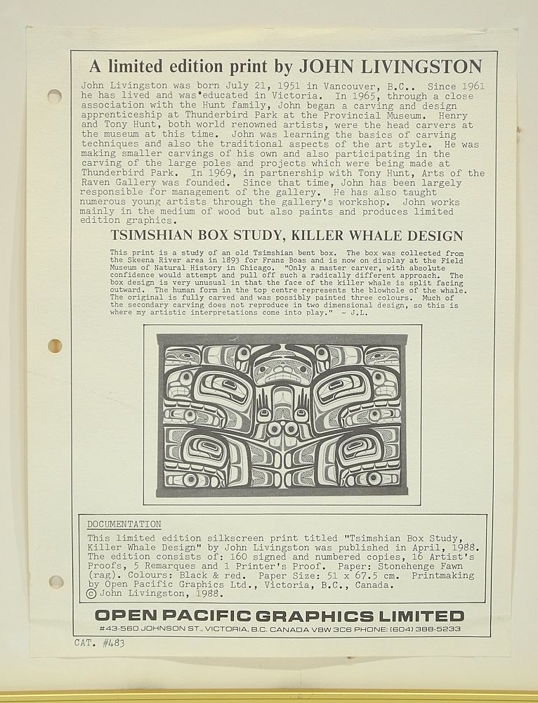 LOT 234 Serigraph signed John Livingston/88, 16 3/4 x 24 1/2", "Tsimshian Box Study", #108/160. Estimate: $120 - $220 Sold For: $250 Auction Date: Tuesday, January 20 2026 at 4:00 PM