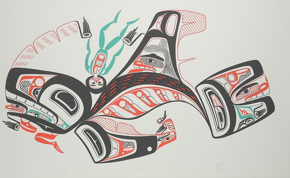 Nisga'a Serigraph signed N. (Norman) Tait, 21 1/4 x 34 1/2", "Five Spirits" #22/75 (stained,u