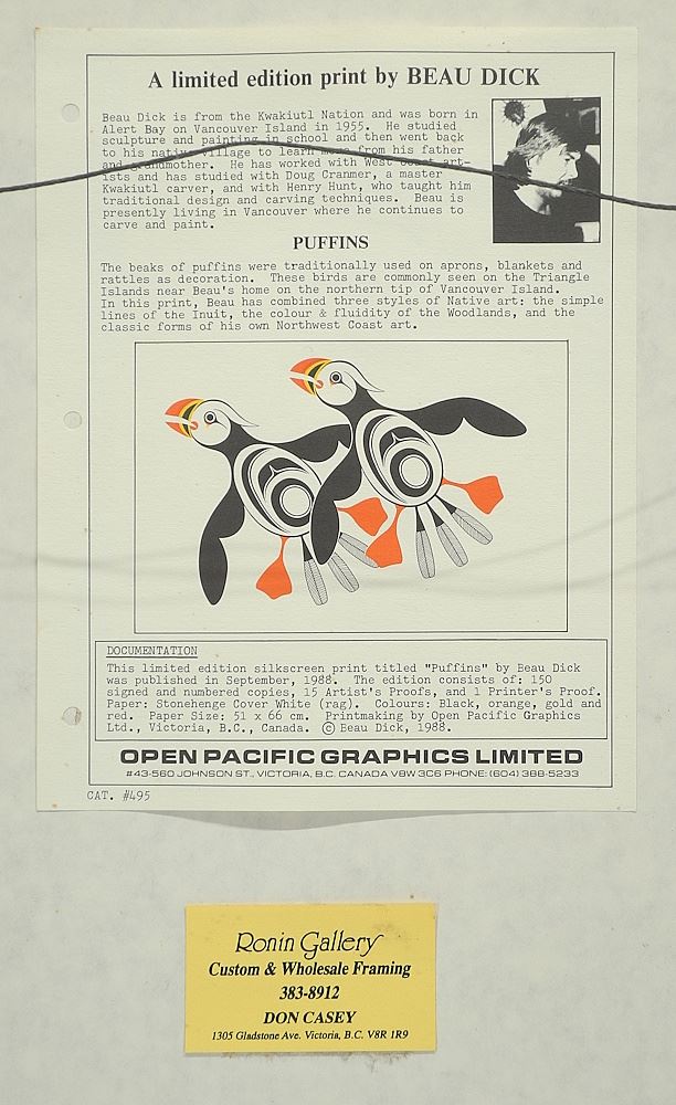LOT 304 Kwagiulth Serigraph signed Beau Dick '88, 19 x 25", "Puffins" #72/150. Estimate: $300 - $500 Sold For: $475 Auction Date: Tuesday, January 20 2026 at 4:00 PM