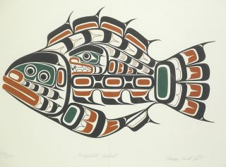 Kwagiulth Serigraph signed George Hunt Jr, 15 1/2 x 21 1/2", #223/250, "Kwagiulth Halibut" 1980.