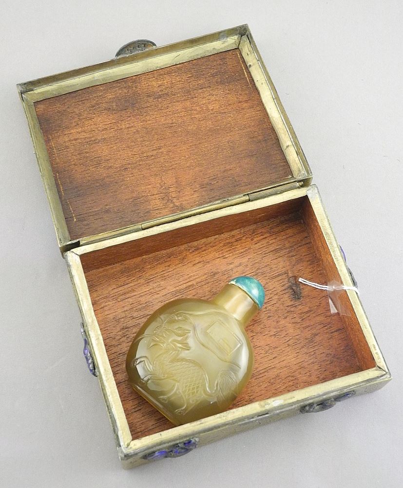 LOT 296 Chinese Agate Snuff Bottle (2 1/4"h) & Enameled Brass Box, 4 1/4"w. Estimate: $60 - $100 Sold For: $130 Auction Date: Tuesday, January 20 2026 at 4:00 PM