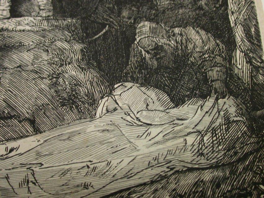 Rembrandt etching, "Decent from the Cross by Torch light", H280, dated 1654, 8 1/2" x 6 1/2".