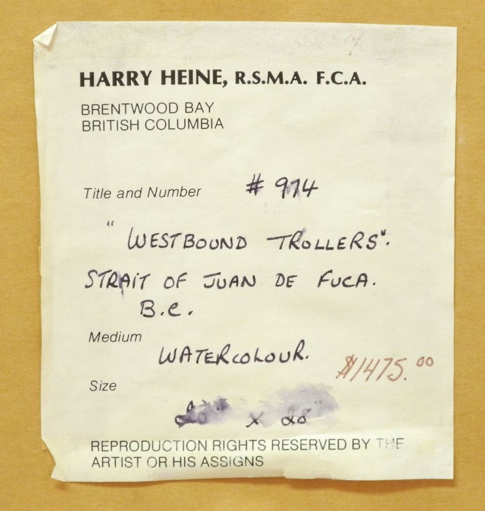 LOT 41 Watercolour signed (Harry) Heine, 19 1/4" x 27", " West Bound Trollers - Strait of Juan de Fuca". Estimate: $400 - $600 Sold For: $440 Auction Date: Tuesday, November 23 2021 at 6:00 PM