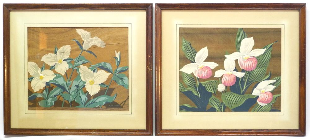 2 Serigraphs on Veneer Signed A.J. Casson, 9 1/4" x 11 1/4", "Moccasin" & Trillium", Split Noted.