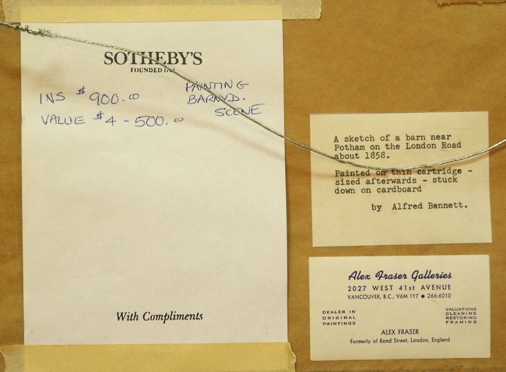 LOT 78 Oil on Paper Laid Down Signed A. (Alfred) Bennett 1859, 9 1/2" x 15", "Barn Near Potham". Estimate: $150 - $250 Auction Date: Tuesday, September 13 2022 at 6:00 PM