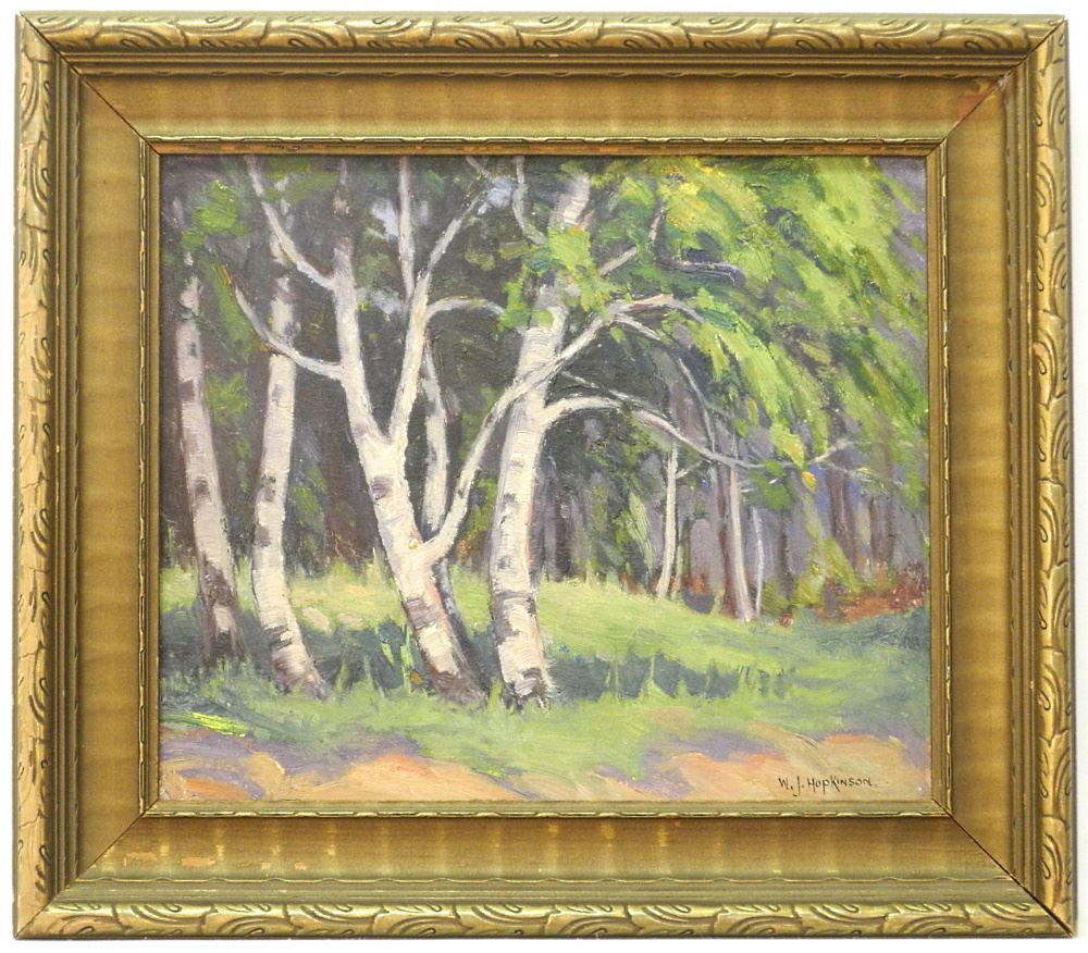LOT 131 Oil on Board signed W.J. Hopkinson, 10" x 11 3/4", "Edge of the Woods". Estimate: $300 - $400 Auction Date: Tuesday, September 13 2022 at 6:00 PM
