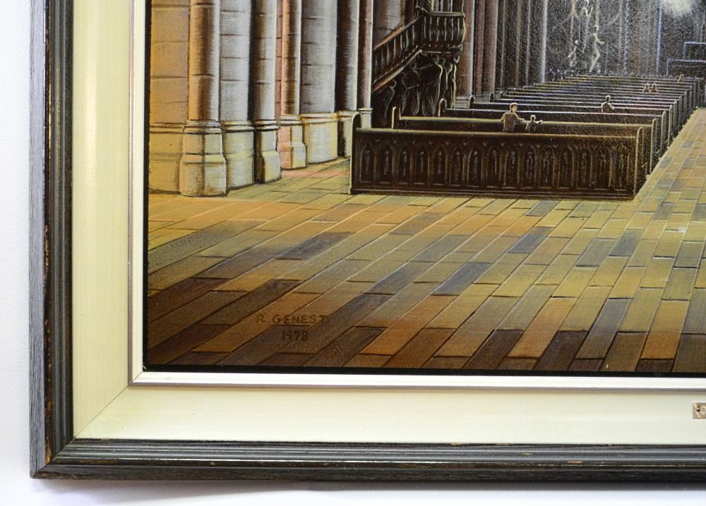 Acrylic on Masonite signed R.(Remie) Genest 1978, 43" x 29 1/2", "Energy & Reason".