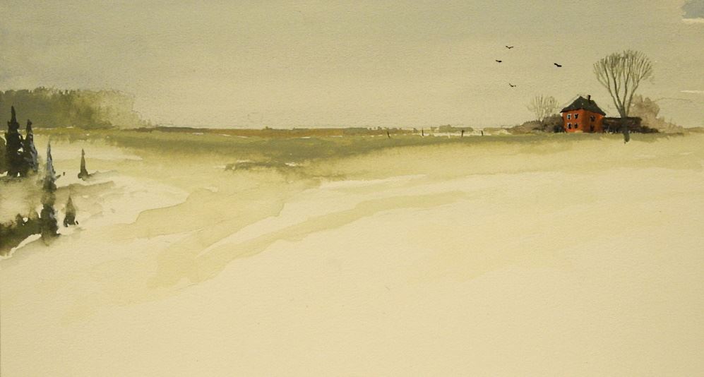 2 Watercolours signed G.(Geoff) Rock, Largest 4 7/8" x 8 7/8", "Field & Old Barn Door".