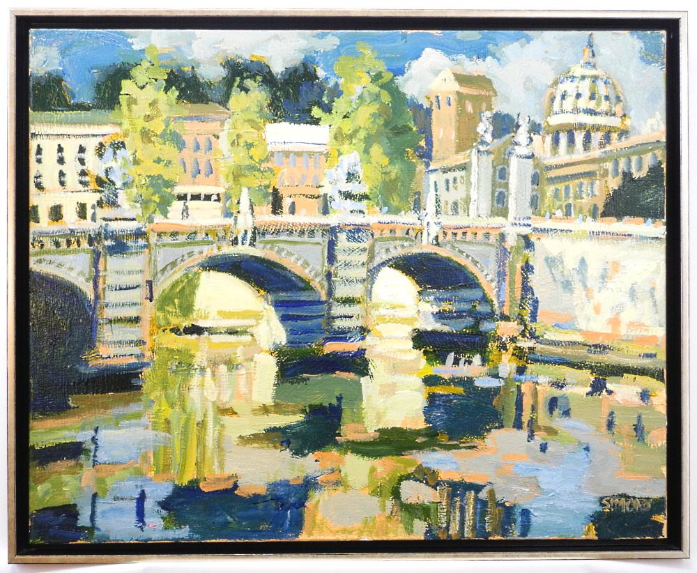 LOT 186 Acrylic on Canvas Signed (Brian) Simons, 24" x 30", Untitled- Bridge View with Dome. Estimate: $400 - $600 Auction Date: Tuesday, September 13 2022 at 6:00 PM