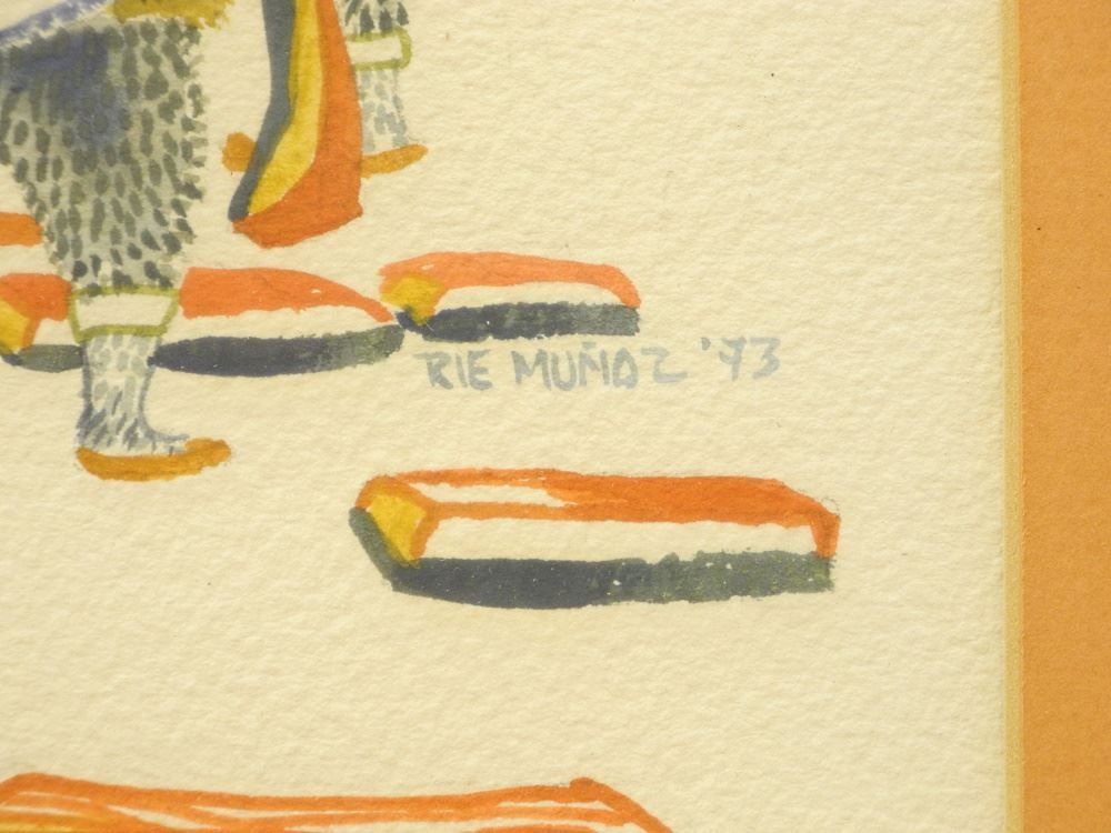 Casein on Paper Signed Rie Munoz 1973, 7 3/4" x 13 1/2", "Divvying up the Muktuk, King Is."