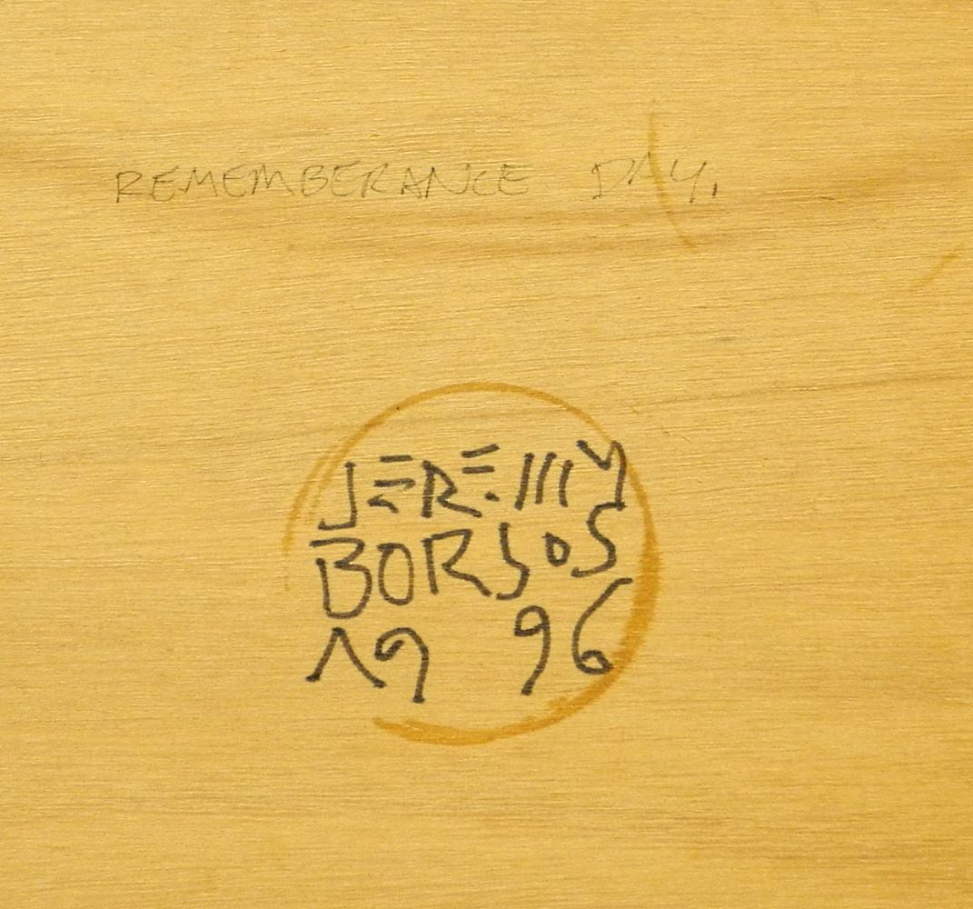 LOT 96 Mixed Media on Canvas Signed Jeremy Borsos 1996, "Remembrance Day" 14" x 14 1/4". Estimate: $100 - $200 Sold For: $350 Auction Date: Tuesday, February 07 2023 at 4:00 PM