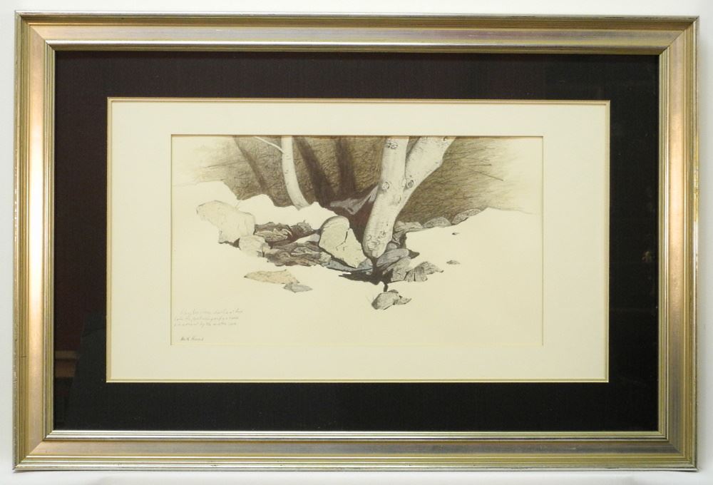 LOT 134 Drawing Signed Keith Hiscock, "Along the Frozen Shoreline" 8 1/4"x 14 7/8". Estimate: $200 - $300 Auction Date: Tuesday, February 07 2023 at 4:00 PM