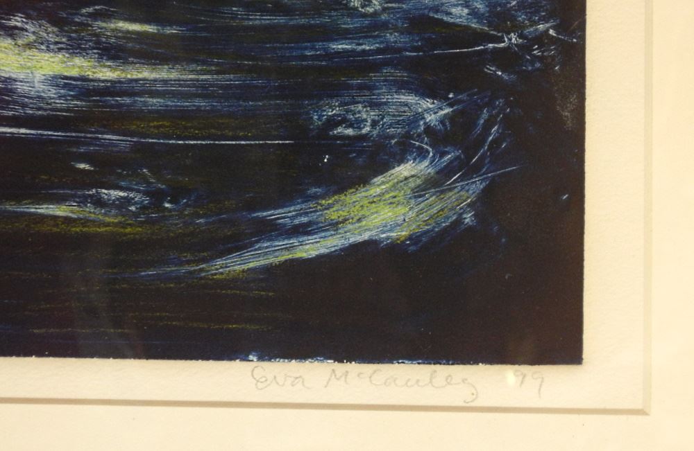 LOT 120 Mixed Media Signed Eva McCauley '99, 40 1/2" x 27 1/2", "Black Water 2", BauXi Label Verso. Estimate: $500 - $700 Auction Date: Tuesday, February 07 2023 at 4:00 PM