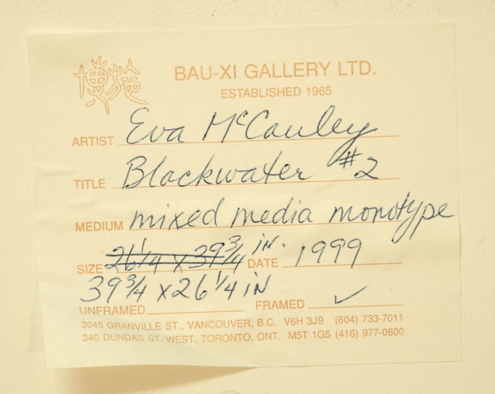 LOT 120 Mixed Media Signed Eva McCauley '99, 40 1/2" x 27 1/2", "Black Water 2", BauXi Label Verso. Estimate: $500 - $700 Auction Date: Tuesday, February 07 2023 at 4:00 PM