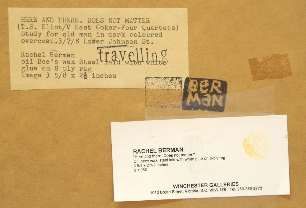 Mixed Media Signed (Rachel) Berman, 3 5/8" x 2 1/2", "Here And There Does Not Matter".