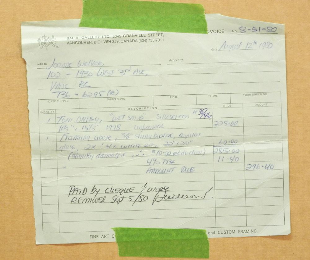 LOT 117 Serigraph Signed (Toni) Onley, 9 1/8" x 16 1/8", "Wet Sand" 35/46. Estimate: $150 - $200 Sold For: $160 Auction Date: Tuesday, April 04 2023 at 4:00 PM