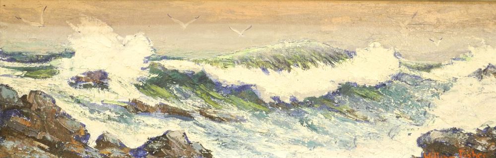 Oil Board Signed William Fisher 5 1/2" X 17 1/2", "Stormy Day Kennesburk, Port Maine".
