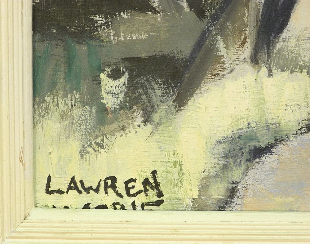 Oil on Masonite signed Lawren Harris, Dominion Gallery 1945 verso, 17 3/4" x 24".