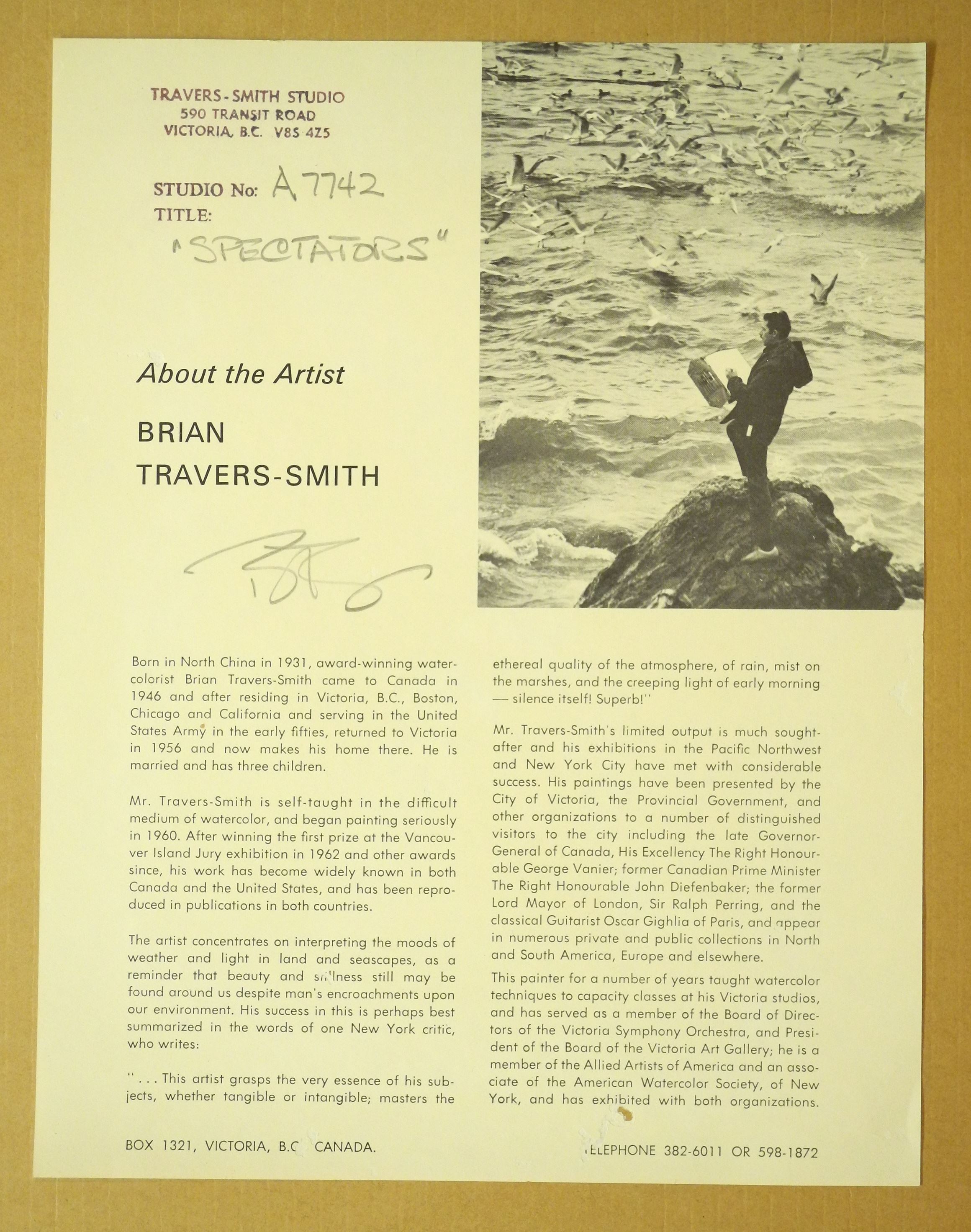 LOT 130 Watercolour signed Brian Travers- Smith, 19 3/8" x 27 1/4","Spectator" -Studio #A7742. Estimate: $300 - $500 Sold For: $300 Auction Date: Tuesday, October 31 2023 at 4:00 PM
