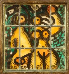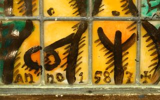 LOT 19 Leaded Glass Panel Attributed to Herbert Siebner, 11 1/4 x 10 1/4", "Anno 1587. Estimate: $150 - $300 Sold For: $150 Auction Date: Tuesday, October 31 2023 at 4:00 PM