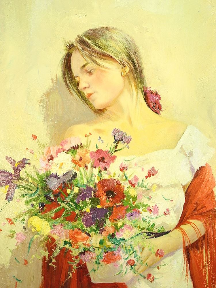 Oil on Canvas signed Roman Frances, 31 1/8 x 15 1/4", "Youthful Beauty".