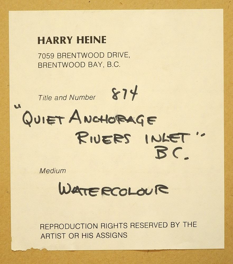 Watercolour signed Heine (Harry), 13 x 9 1/2", "Quiet Anchorage-Rivers Inlet".