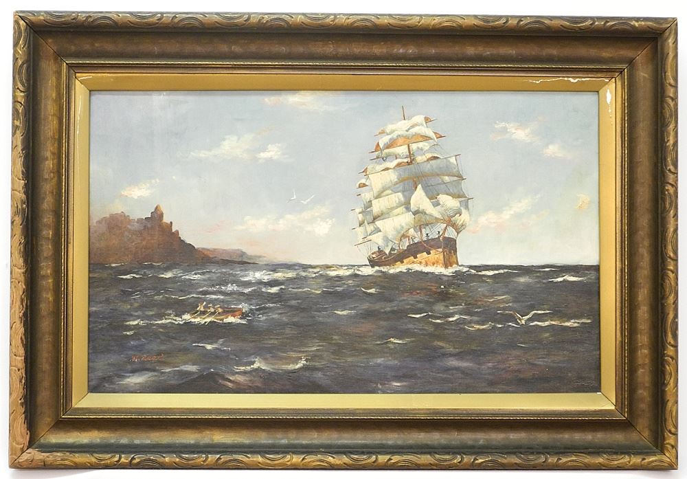 Oil on Canvas signed E. Read (Edward Harry Hardley), 11 3/4 x 19 3/4", "Tall Ship & Row Boat" (ri