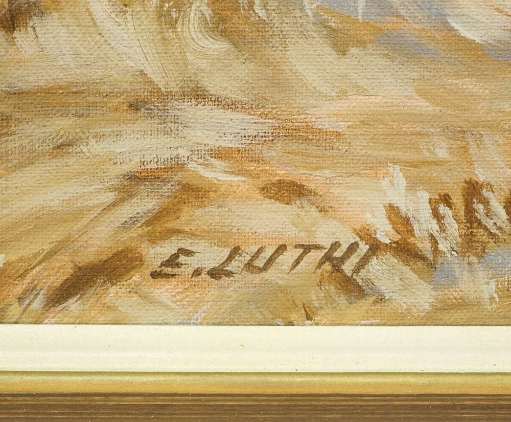 Acrylic on Board signed E (Ernest) Luthi, 12 x 16", "N. West of Drake Nov 20-75".