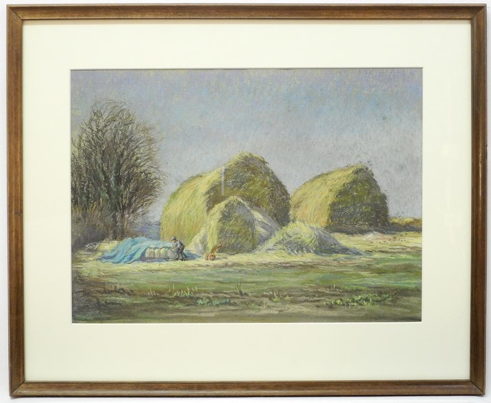 Pastel signed A. Margaret Cornish 1942, 12 x 16 3/4", "Haystacks".