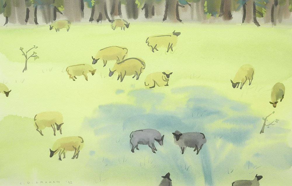 LOT 71 Watercolour signed C.(Colin) D. Graham'92, 13 5/8 x 21 1/8", "Field of Munchers". Estimate: $100 - $200 Sold For: $110 Auction Date: Tuesday, October 31 2023 at 4:00 PM