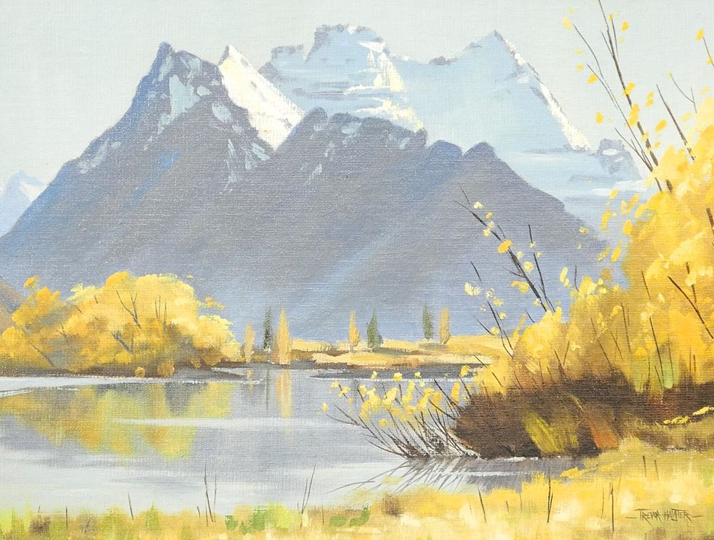 Oil on Board signed Trevor Hayter, 11 1/8" x 17 1/8", "Autumn Morning Mt. Earnslaw".