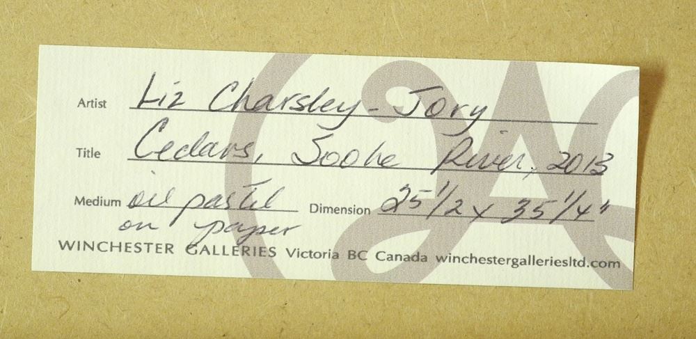 LOT 107 Oil Pastel on Paper signed Liz Charsley-Jory 2013 verso, 25 1/2" x 35 1/4", "Cedars, Sooke Ri Estimate: $200 - $400 Sold For: $375 Auction Date: Tuesday, March 05 2024 at 4:00 PM